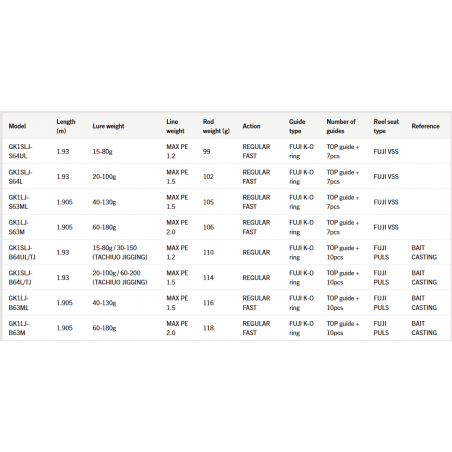 Light Jigging, los modelos de Súper Rayo Ligero (SLJ) y Tachiuo Jigging (TJ) estarán disponibles próximamente. Light Jigging: Modelo muy recomendable para aquellos que buscan placer en la lucha contra los peces con aparejos de luz. SLJ y TJ: Con un jig de metal de alrededor de 50g, encontrarás estos modelos más adecuados para coger besuelo de mar y peces gruñidos, conocidos por su preferencia sólo por pequeños cebos. Gracias al Bajo Respuesta en blanco con la construcción de módulos de carbono interminables, reduce el estrés para los pescadores y trae mucha emoción con peces de combate. Giant Killing 1G light jigging serie ofrece una experiencia de buena calidad en el agua cercana a todos los pescadores.