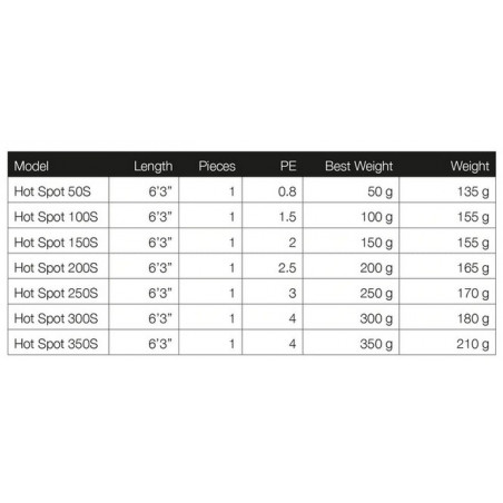 Desarrollado para la pesca de jigging lento. Son varillas de primera calidad con los mejores componentes Fuji. Toda la serie Hot Spot S incorpora guías de monopata Fuji SIC y portacarretes de carrete fijo. Excepcionalmente ligero en la mano, pero inflexible en el poder.
