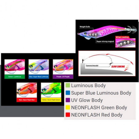 SBTP - ''Purple'' para la noche de luna. Especial para bajo la luz de la luna o alrededor de farolas. Combinando la base luminosa superazul que es muy visible para el calamar con un púrpura más claro, tiene una capacidad excepcional para atraer al calamar en una amplia zona.