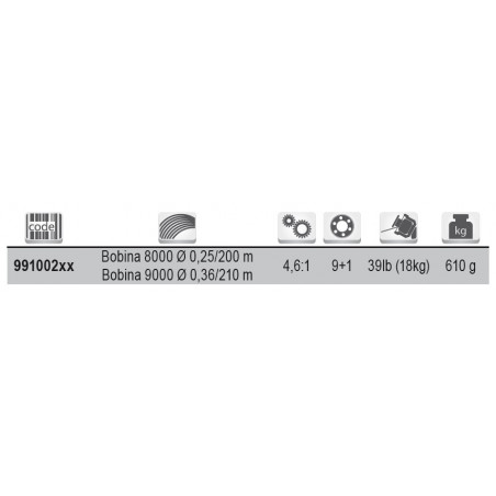 Capacidad línea Nylon 8000(mm-m): 0.20 mm-570 m / 0.25 mm-350 m / 0.30 mm-250 m