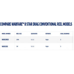 El PENN® Warfare II star drag ha sido diseñado para ser un carrete extremadamente versátil a un precio asequible. Cuenta con un bastidor de grafito ligero y placas laterales con aros de aluminio para mejorar la rigidez y evitar la flexión del bastidor. Los discos de freno HT-100 proporcionan un freno suave bajo cargas pesadas. Las anillas de capacidad de hilo