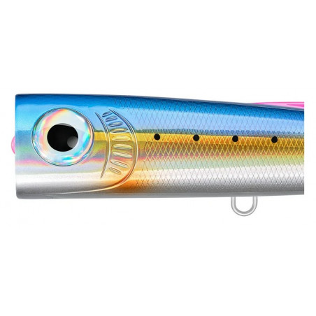 Lo llamamos Popper Mixto porque tiene varias aplicaciones y varias formas de trabajarlo. Con recuperas de velocidad media y pequeñas películas de muñeca, obtenemos el chapoteo de un andador de superficie, pero creamos muchas más salpicaduras. Al recuperar con sacudidas y movimientos erráticos, creamos una acción que simula muy bien un pez herido o una presa fácil para los depredadores al generar muchas salpicaduras y romper muy bien la superficie. Si damos tirones largos, obtenemos el movimiento de un popper de buceo a medida que el señuelo desciende de la capa superficial del agua y genera muchas burbujas, cruciales para atraer la atención de los depredadores y atraerlos a morder.