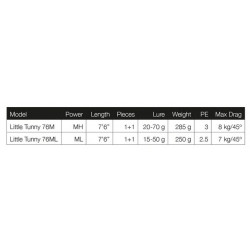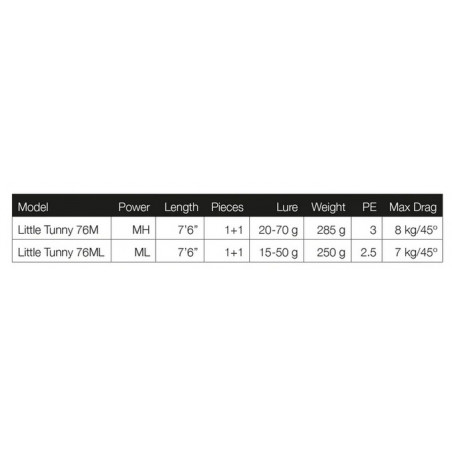 La serie Little Tunny ha sido especialmente desarrollada para la pesca de spinning medio. Son cañas de acción media, muy ligeras pero a la vez con una muy buena reserva de potencia que permite trabajar grandes capturas con suficiente comodidad.