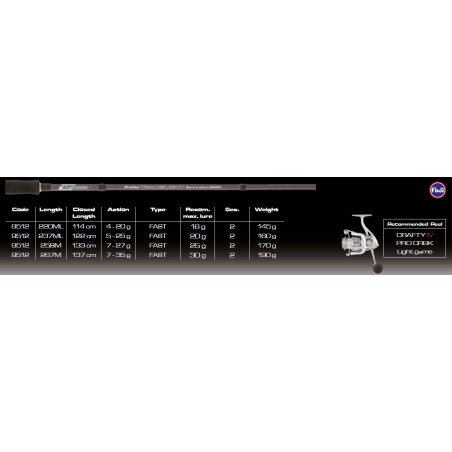 Esta caña, destaca por un blank de gran calidad y un inconfundible aspecto. Está fabricada con una combinación de carbono 24T procedente de Japón. La conicidad de su blank, sensible en la puntera y con una gran reserva de potencia en su tercio base, ofrece una respuesta rápida y sensitiva que nos permite un amplio rango de uso de señuelos. Está montada con anillas Fuji BC-KLOG y portacarretes Fuji VSS. Se sirve en funda de tela con divisiones internas y cierre de velcro para protegerla de la humedad, polvo y arañazos.
