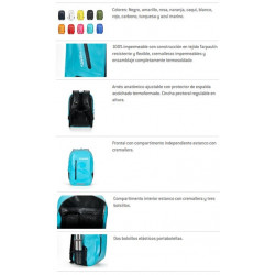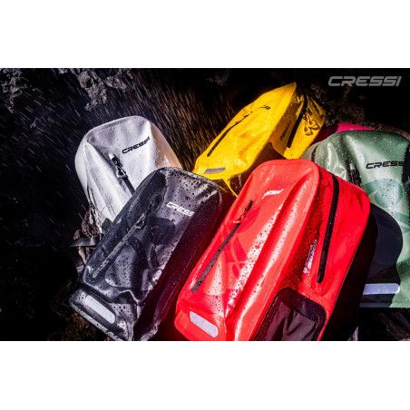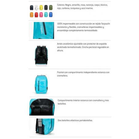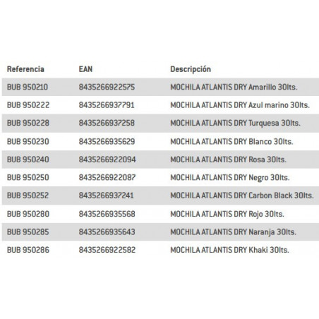 ATLANTIS DRY es una pequeña mochila todoterreno 100% impermeable, con construcción en tejido Tarpaulín resistente y flexible, cremalleras impermeables y ensamblaje completamente termosoldado. Sus medidas de 46 x 32 x 18,5 cm , volumen de 30 litros y peso de 980 g, la hacen perfecta para cualquier actividad: náutica, natación, playa, moto, bici,trekking, escuela, uso urbano y para el día a día.