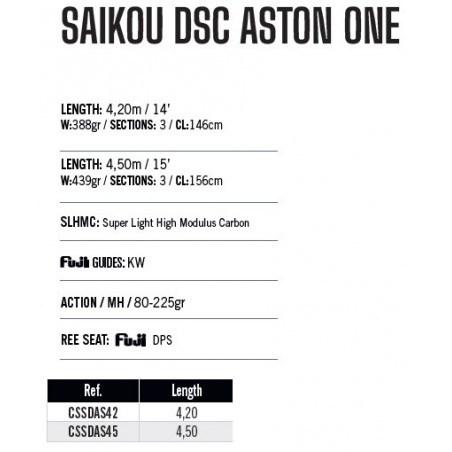 Caña Yuki Saikou DSC Aston One 420 es una caña construida en carbono de alto modulo y montada con porta carretes Fuji DPS y anillas Fuji KW. Tiene una acción de 80-225 gramos, es una caña muy fina y tiene un peso de solo 439 gramos, esto junto a su acción semi parabólica acompañada de un hibrido medio/blando la hace una caña espectacular para pesca a media y corta distancia.