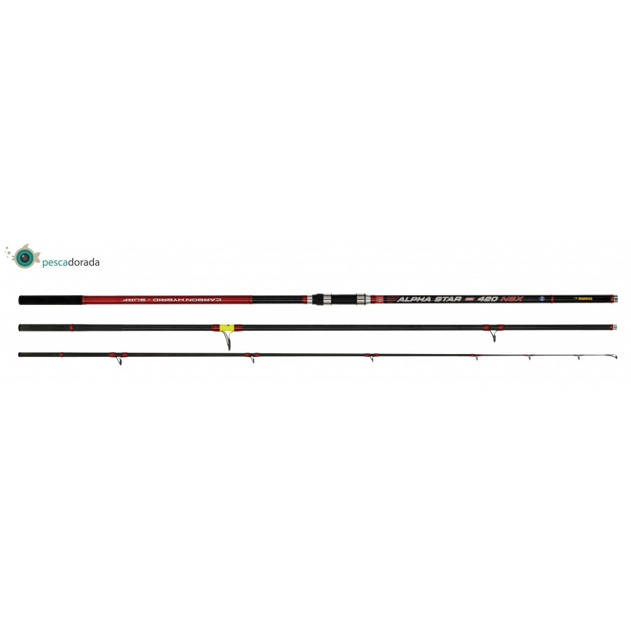 Caña de carbono de tres tramos con puntera híbrida de carbono macizo y empuñadura reforzada con carbono. La ALPHA STAR, con una longitud total de 4,20 m, viene equipada con portacarretes DPS y anillas Fuji MN O-Ring. Esta caña para surfcasting tiene una capacidad de lance de hasta 230 g.